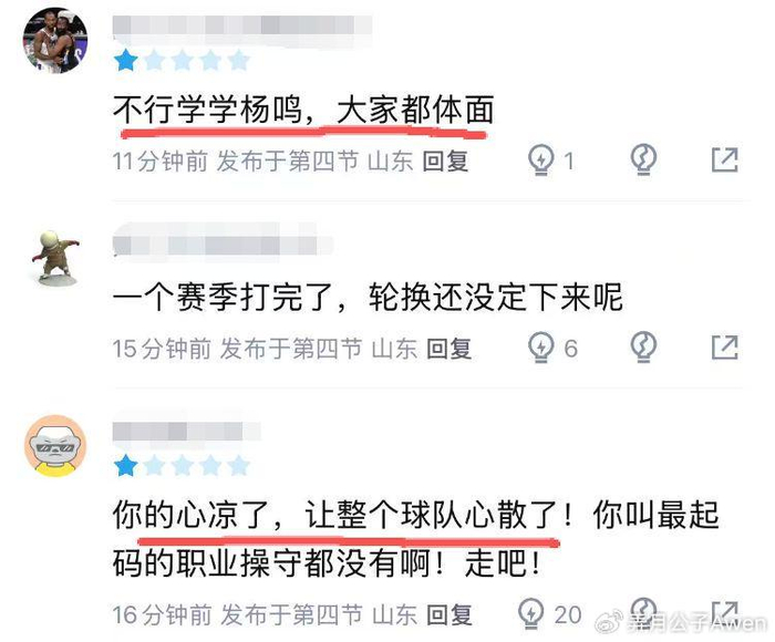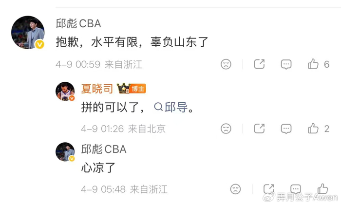 上一轮山东以6分之差惜败广厦的赛后,邱彪在社媒表示:“抱歉,水平有限,辜负山东了。”山东媒体人回复:“拼的可以了,邱导。”但邱彪的回应是:心凉了。